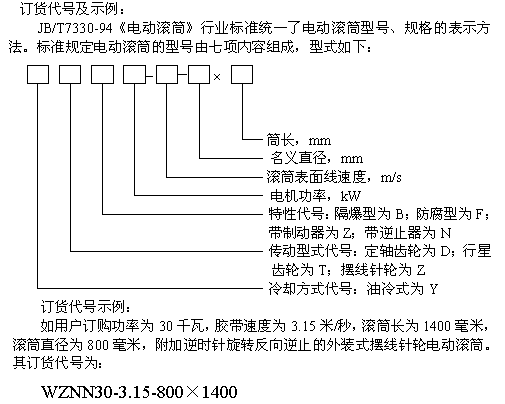 (1).因目前外裝式電動(dòng)滾筒尚未制定相關(guān)行業(yè)標(biāo)準(zhǔn),本廠將該型號(hào)電動(dòng)滾筒首位代號(hào)用W(“外裝”的首位漢語(yǔ)拼音)表示。外裝式電動(dòng)滾筒外置電機(jī)可分為立式電機(jī)和臥式電機(jī),用戶訂購(gòu)時(shí)請(qǐng)加以說(shuō)明;